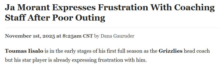 北京时间11月1日,伊萨洛作为灰熊队主教练的首个完整赛季才刚刚起步,他麾下的核心球员已对他表达出不满情绪。